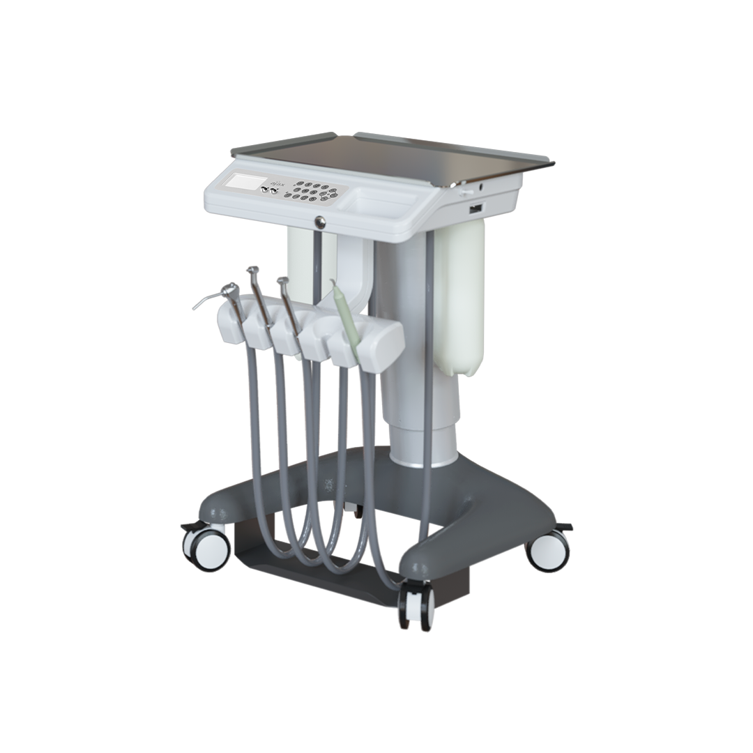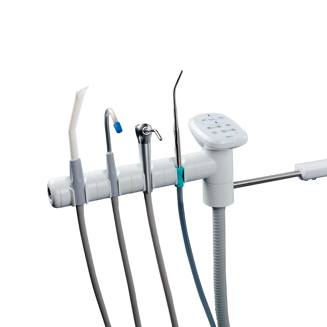 В комплект входят три 4-канальных шланга производства США с коннекторами из нержавеющей стали, два многофункциональных пистолета, шланги пылесоса и слюноотсоса с металлическими наконечниками, а также ёмкости: для дистиллированной воды объёмом 1500 мл и для дезинфицирующего раствора объёмом 1300 мл.