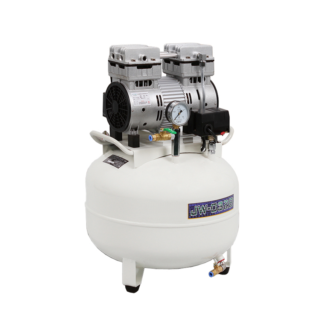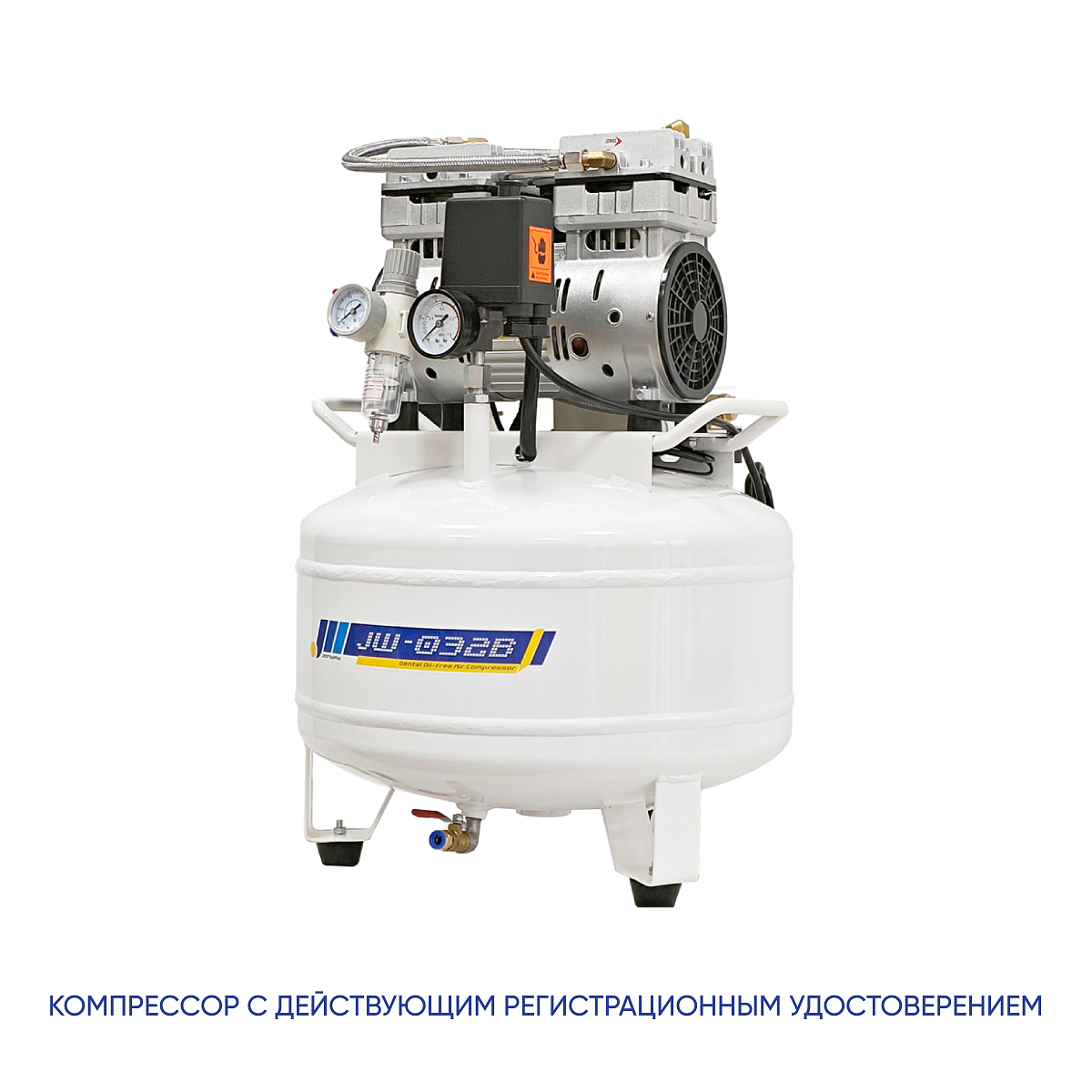 Безмасляный стоматологический компрессор рассчитан на обслуживание одной установки, оснащён ресивером объёмом 45 литров и обеспечивает производительность до 100 л/мин.