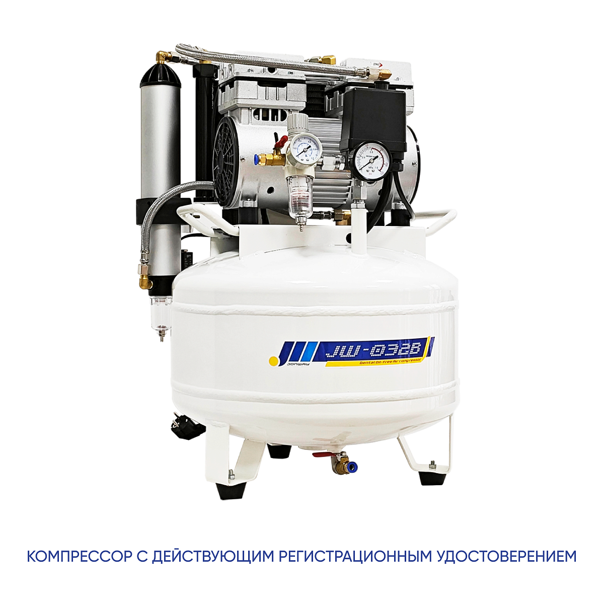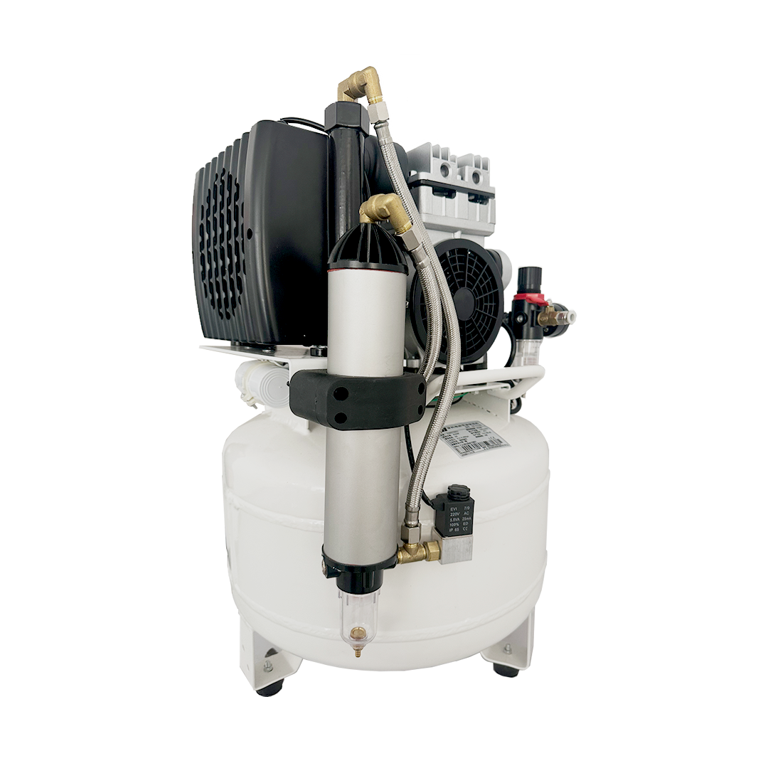 Безмасляный стоматологический компрессор предназначен для работы с двумя установками и оснащён встроенным осушителем. Объём ресивера составляет 45 литров, производительность — 64 л/мин при давлении 0,5 МПа.