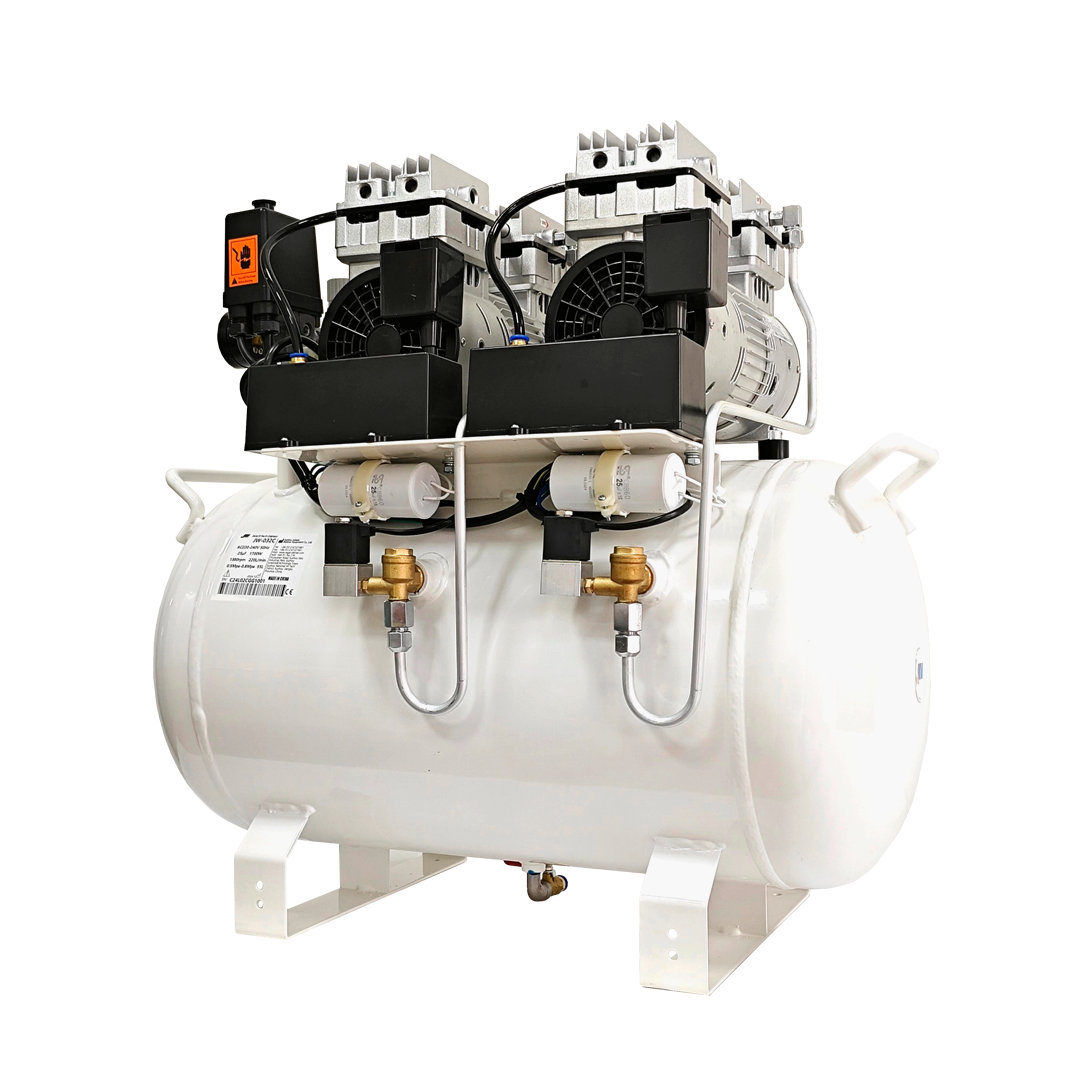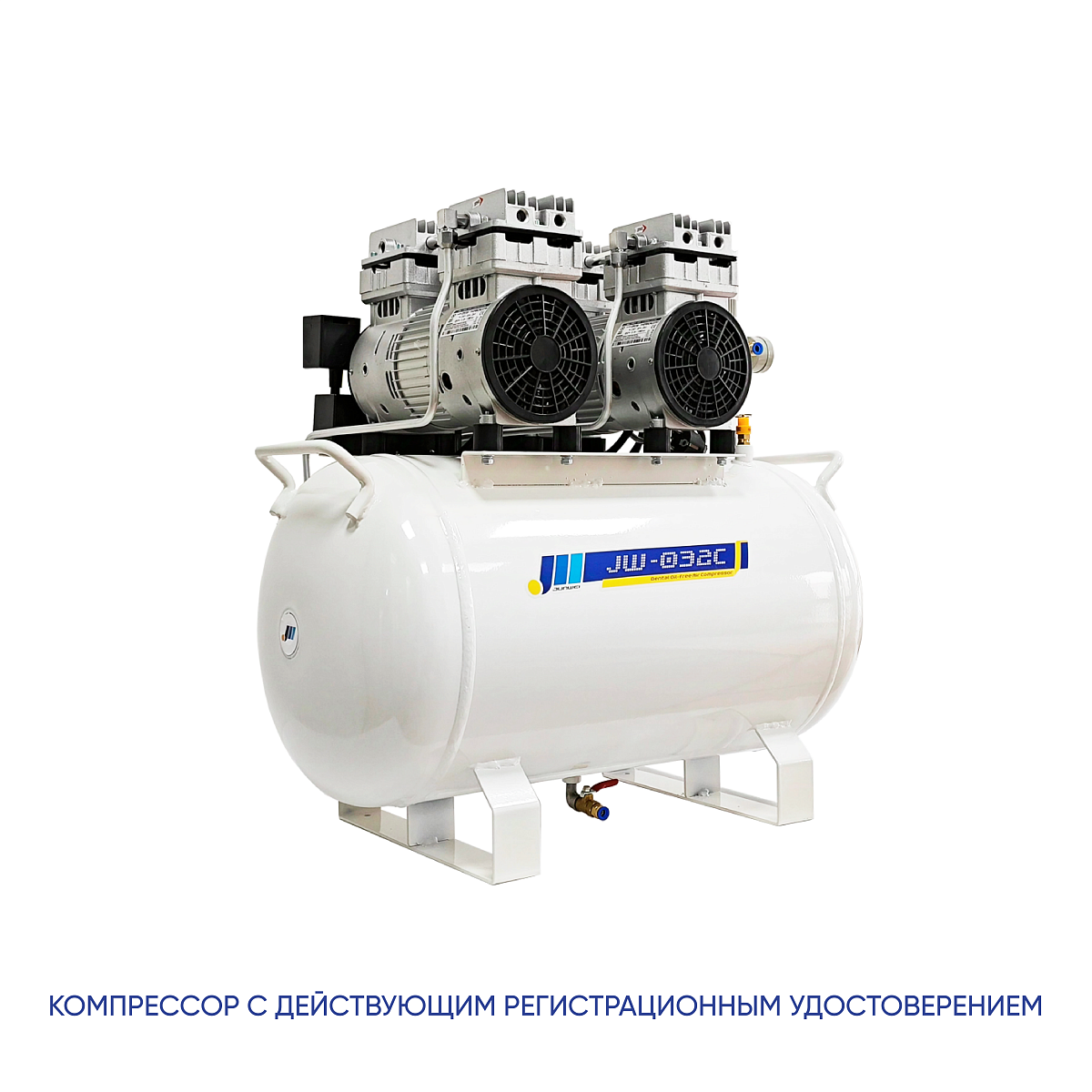Безмасляный стоматологический компрессор рассчитан на одновременную работу с тремя установками. Оснащён ресивером объёмом 55 литров и обеспечивает производительность до 220 л/мин.