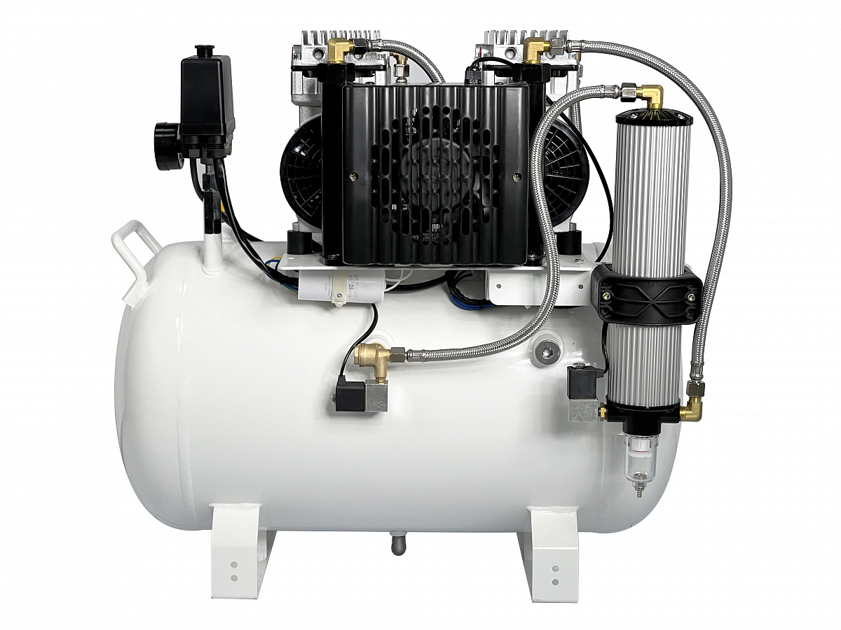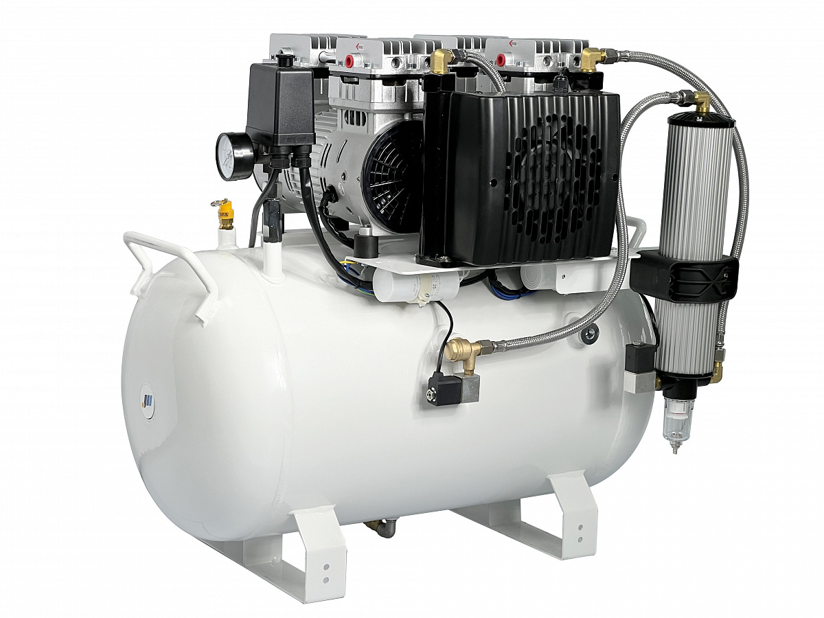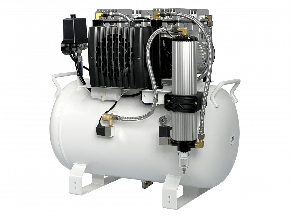 Безмасляный стоматологический компрессор предназначен для одновременной работы с тремя установками и оснащён встроенным осушителем. Объём ресивера составляет 65 литров, производительность — 128 л/мин при давлении 0,5 МПа.