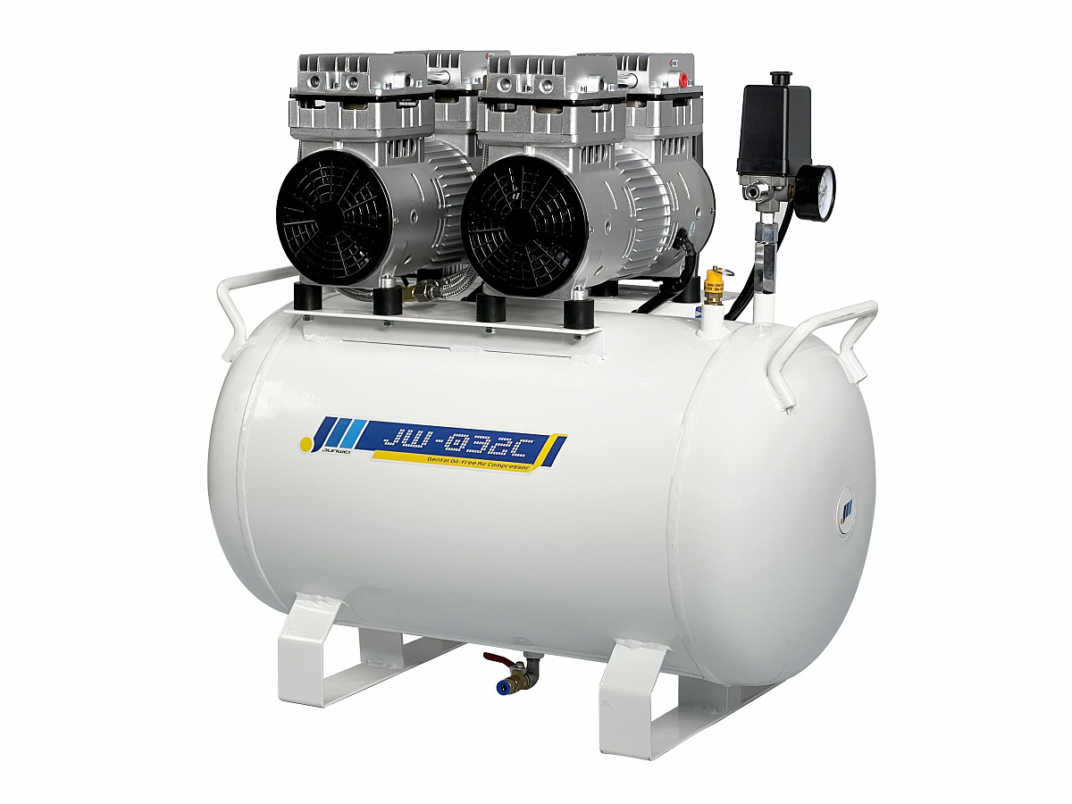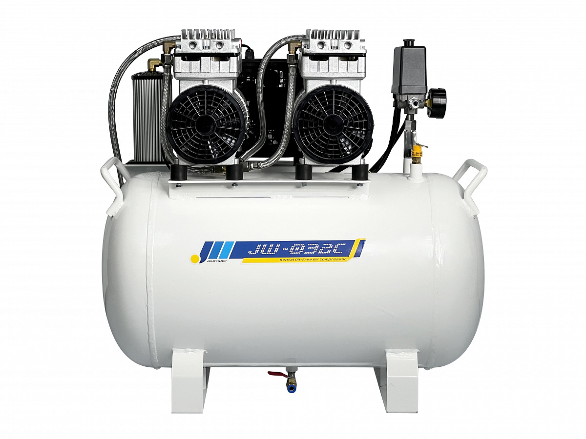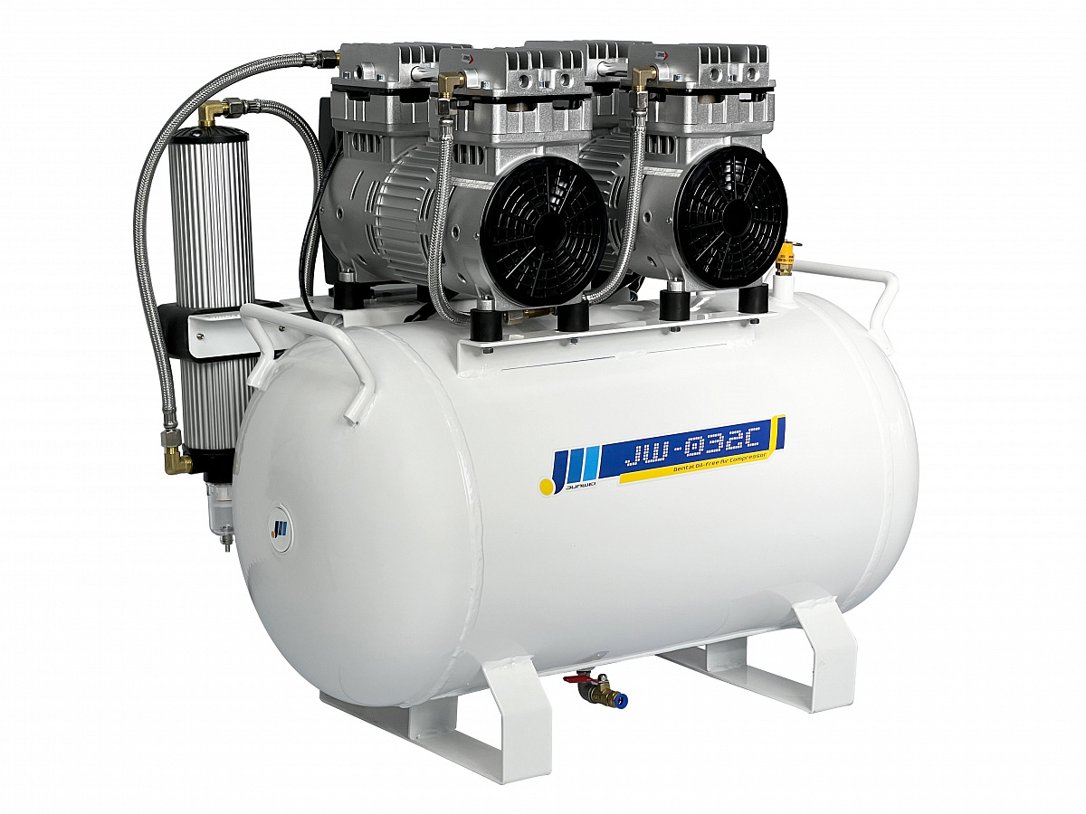 Безмасляный стоматологический компрессор предназначен для одновременной работы с тремя установками и оснащён встроенным осушителем. Объём ресивера составляет 65 литров, производительность — 128 л/мин при давлении 0,5 МПа.