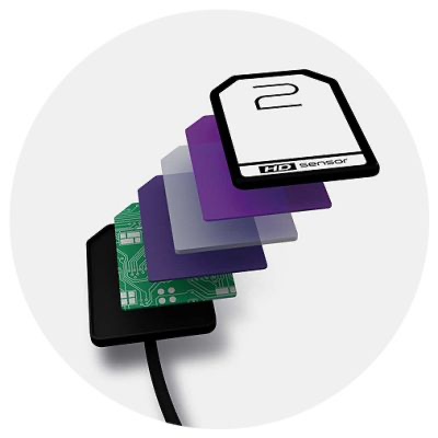 Сенсор построен по трёхслойной схеме CsI → FOP → CMOS: сцинтиллятор на основе йодида цезия формирует сигнал, фиброоптический фильтр защищает матрицу от прямого излучения и улучшает контраст, CMOS фиксирует изображение с глубиной 14 бит (16 384 оттенка серого). Такая конструкция повышает информативность снимков и позволяет работать на низких экспозициях.